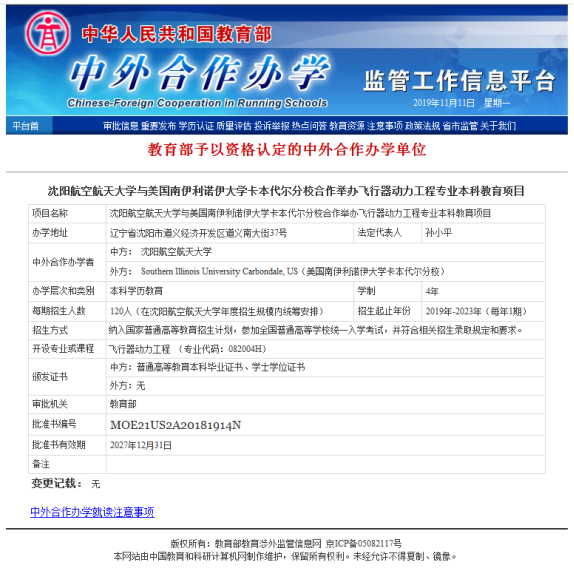 飞行器动力工程专业中美合作办学项目为沈阳航空航天大学与美国南伊利诺伊大学卡本代尔分校合作举办的本科教育项目,于2018年经国家教育部批准(批准书编号:MOE21US2A20181914N)。网站链接http://www.crs.jsj.edu.cn/aproval/getbyarea/21双方整合优质的教育教学资源,共同商定教学计划,旨在培养适应现代科学技术与经济社会发展需要,拥有先进技术和管理理念,国际沟通能力较强的应用型、创新型、国际化专业人才。