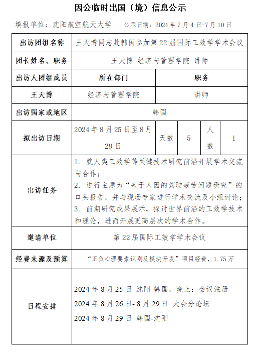 应第22届国际工效学学术会议的邀请,今年会拟派王天博同志于2024年8月25日至8月29日赴韩国参加第22届国际工效学学术会议。按照省外办有关最新管理规定,现就此计划予以公示。公示日期:2024年7月4日-7月10日。如有异议,可在公示期内与外事处联系,电话:024-89724878,邮箱:foreignaffairs@sau.edu.cn。