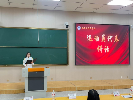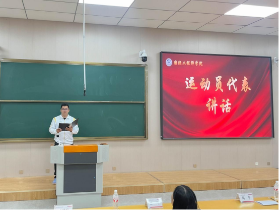 男子运动员代表寇周奕男在发言中表示,全体运动员将严格遵守大会纪律,发扬优秀体育道德,秉承“友谊第一,比赛第二”的宗旨参加本届运动会,在比赛中,服从领导,服从指挥;尊重裁判,尊重对手;团结协作,勇于拼搏;赛出风格,赛出水平,用实际行动展现属于国工学子的精神风貌。