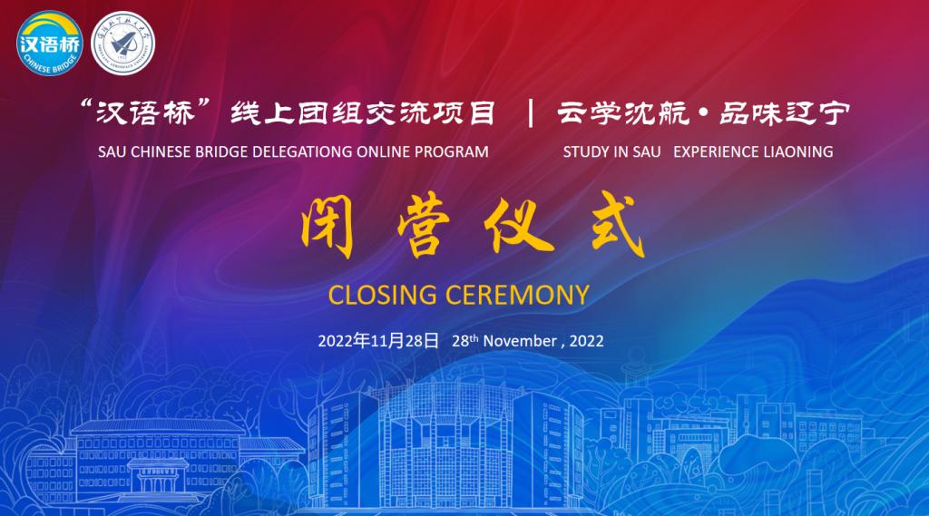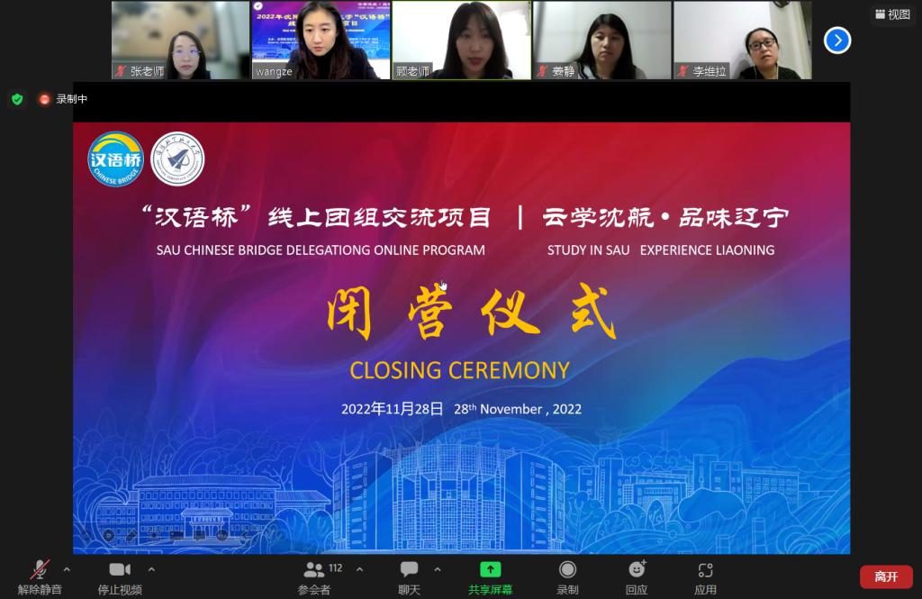 2022年11月28日,由教育部中外语言交流合作中心主办,沈阳航空航天大学承办的2022年“汉语桥”线上团组交流项目——“云学沈航 品味辽宁”冬令营顺利闭营!国际教育学院汉语教师王泽主持了本次闭营仪式。