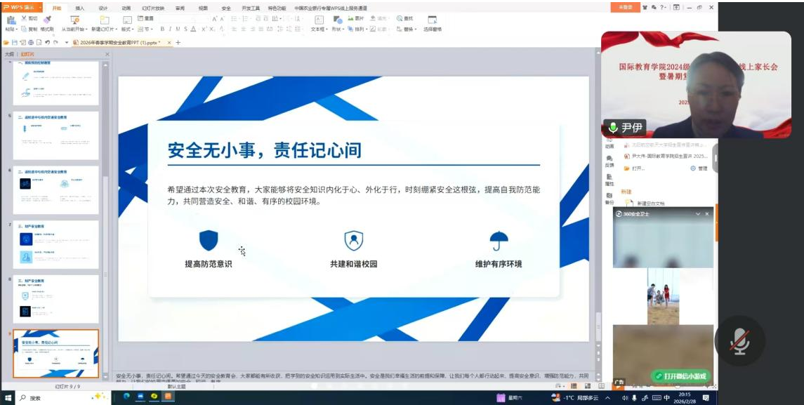 春启新程,逐梦前行。为筑牢校园安全防线,衔接新学期学业规划,强化思想引领与成长赋能,国际教育学院学工办以“精准施策、暖心服务”为原则,分层开展线上周讲评、线下“开学第一课”等主题教育活动,助力全体学生快速切换“学习模式”,为新学期保驾护航。